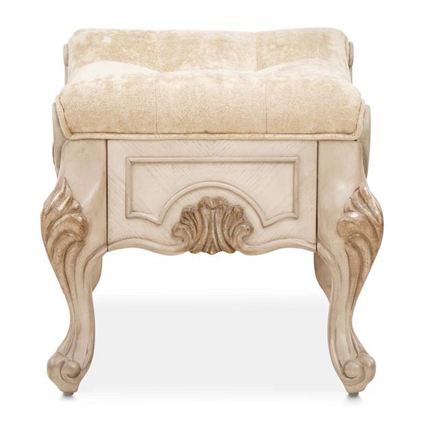 Banco de tocador Royale Champagne Platinum. La colección Platine de Royale de Jane Seymour y Michael Amini es rica y atemporal, tal vez recuerda a los muebles transmitidos de generación en generación, pero interpretados con estilo para los hogares de hoy en día con un acabado champán. El francés clásico es el corazón y el alma de la magnífica colección.
