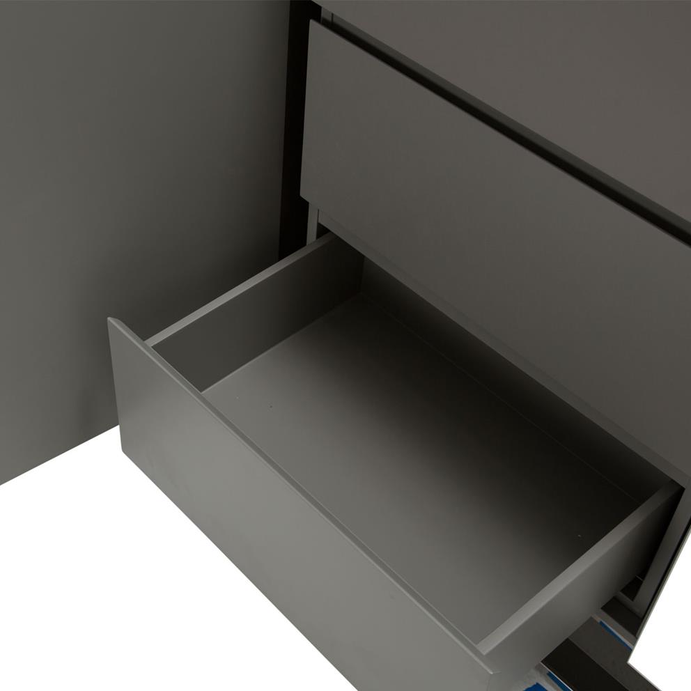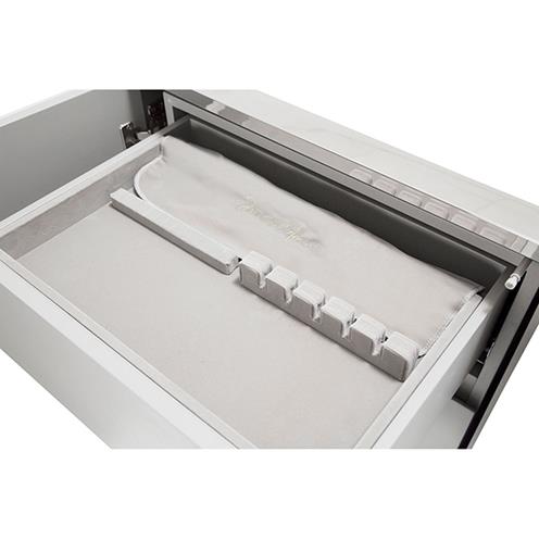 - El gabinete central contiene 3 cajones con deslizadores de cierre suave, y un cajón de cubiertos forrado de terciopelo en el lado superior
