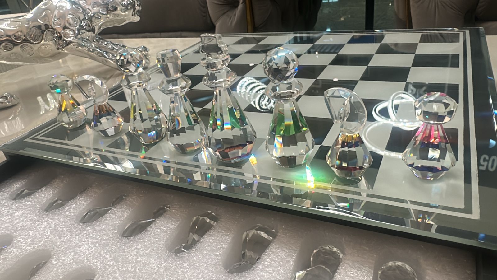 Caja decorativa de espejo con hermoso ajedrez de cristal.