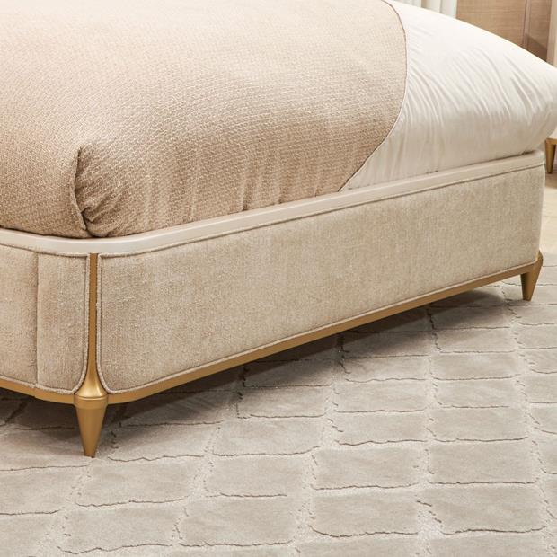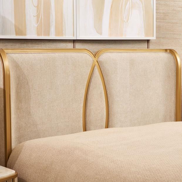 El diseño armonioso de esta cama se extiende hacia su base, con líneas suaves y detalles sutiles que la hacen visualmente ligera, a pesar de su estructura sólida. El banco a los pies de la cama, tapizado en el mismo tono que el resto de la pieza, añade funcionalidad y refuerza el equilibrio estético del conjunto. Los acabados metálicos dorados en las patas y bordes brindan un toque de sofisticación que eleva el nivel del mobiliario.