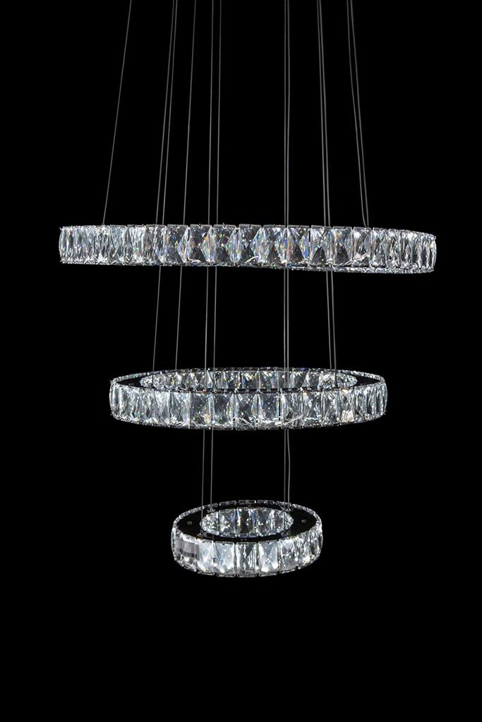 Anillos redondos de araña LED de asteroides. Diseñado con impresionantes capas y equilibrio, Asteroids es el verdadero candil de lujo. Tres anillos de cristal se inclinan y se cruzan, nivelados con un anillo horizontal debajo. Esta pieza cuenta con luces LED regulables y líneas ajustables.