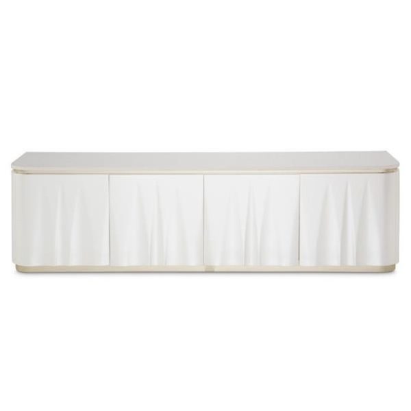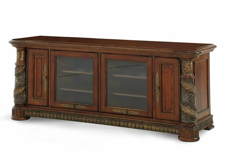 Elegante mueble de TV, en fina madera labrada con aplicaciones de mármol y cristales biselados. La colección Villa Valencia se basa en esta historia, y desde su relieve de mármol hasta los exclusivos revestimientos de vidrio biselado multifacético, Villa Valencia es una colección atemporal para ser atesorada año tras año.