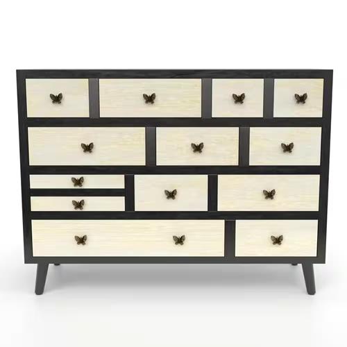 El Chest Mariposas es un mueble que destaca por su diseño encantador y original, ideal para aportar un toque de personalidad y calidez a cualquier espacio. Su estructura combina un acabado en tonos claros y oscuros que crean un contraste armonioso, resaltando cada uno de sus múltiples cajones. Cada cajón está adornado con un tirador en forma de mariposa, un detalle delicado y distintivo que añade un toque artístico y natural al diseño.