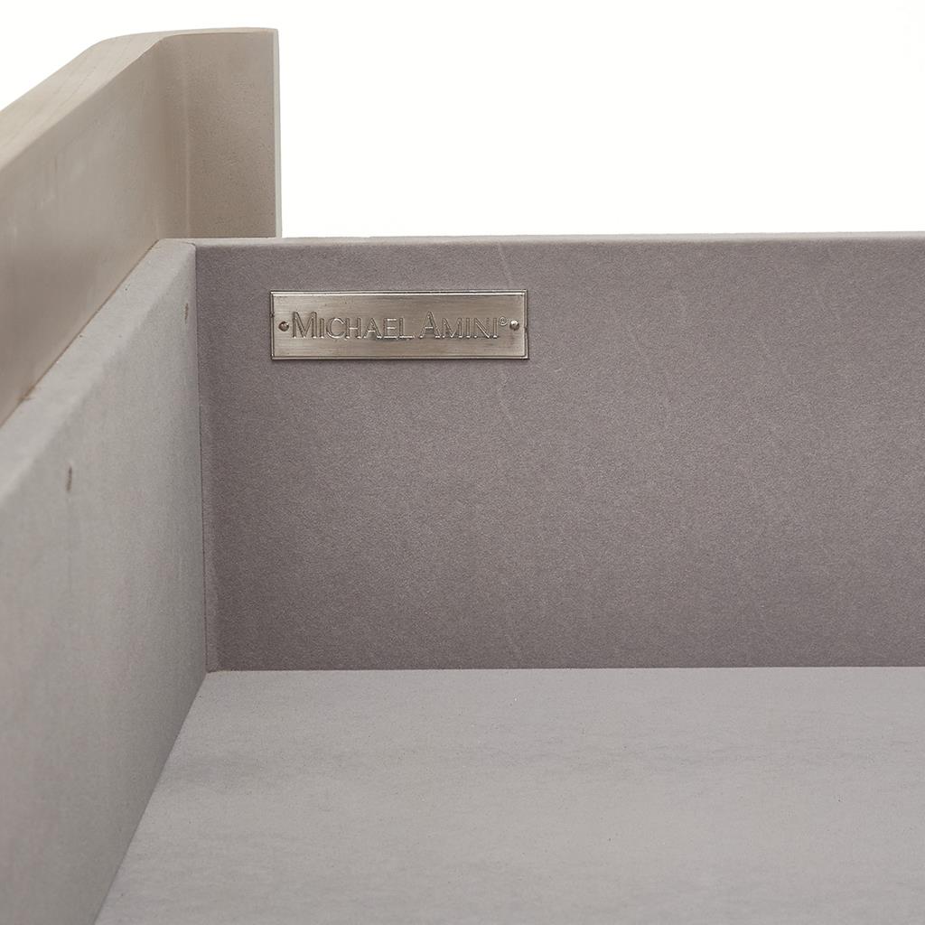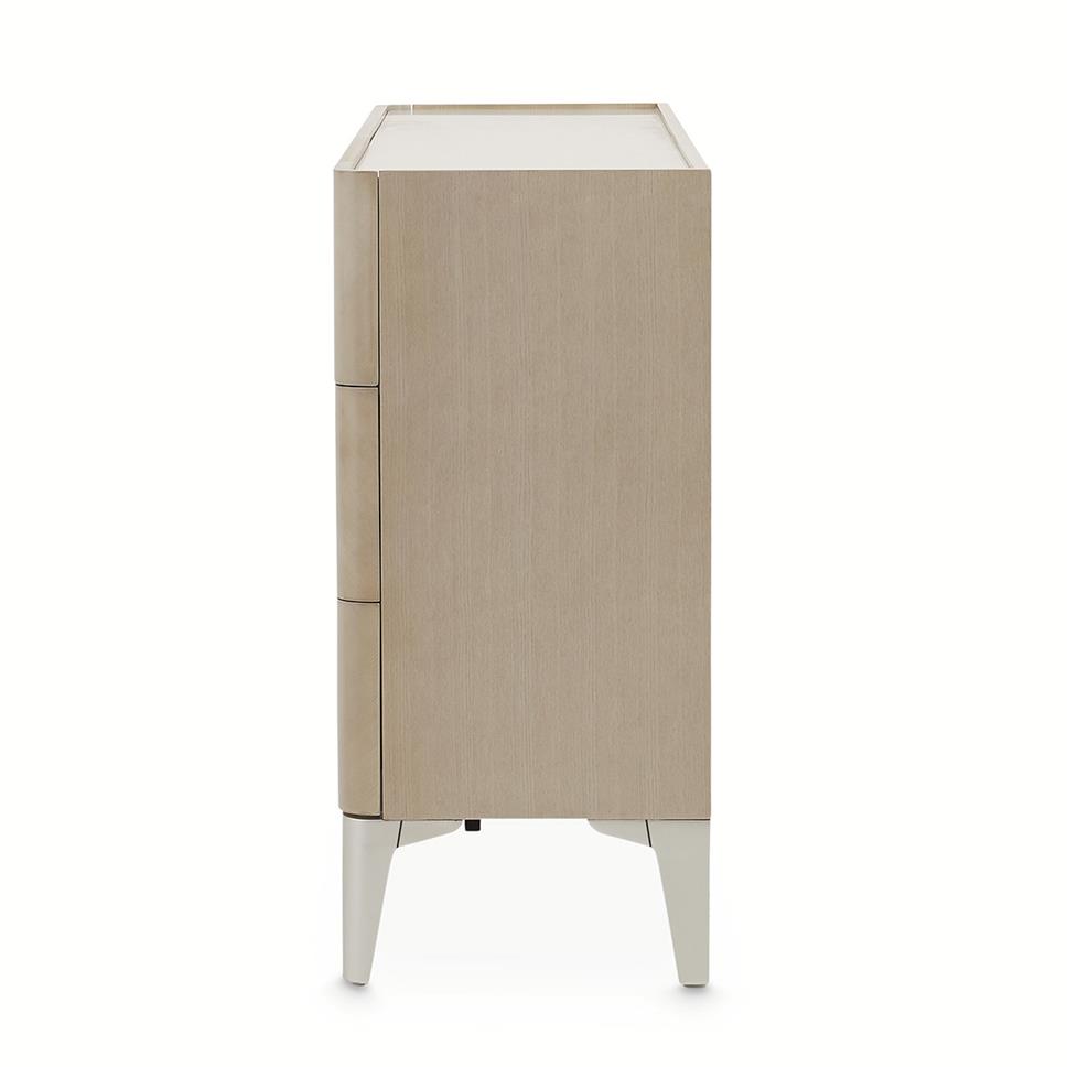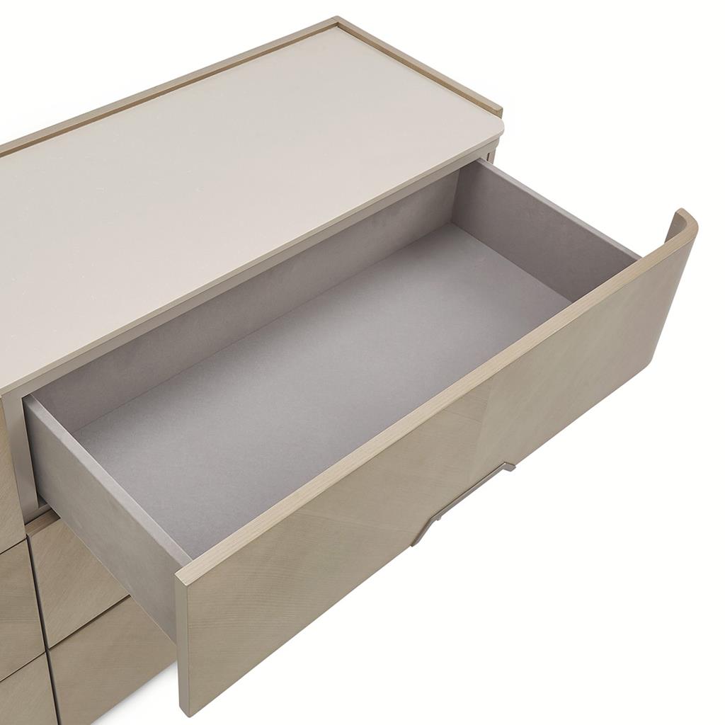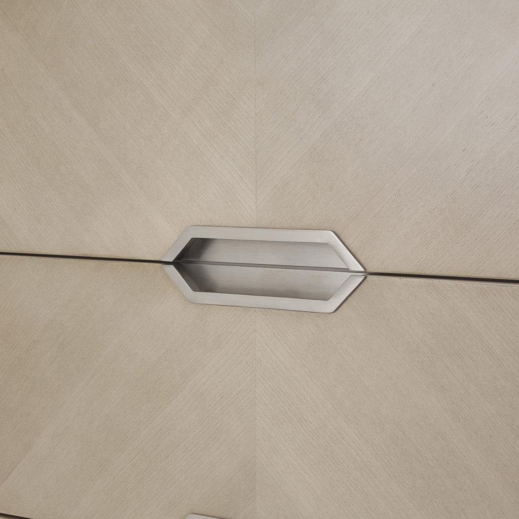 La Penthouse Dresser es una pieza que combina elegancia urbana con funcionalidad sofisticada. Su diseño limpio y estructurado refleja una estética moderna, ideal para interiores de inspiración contemporánea o minimalista. El acabado en tonos neutros suaves aporta una sensación de calma y lujo discreto, mientras que el sutil patrón de vetas en diagonal sobre los frentes de los cajones introduce un toque visual interesante sin sobrecargar el diseño.