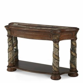 La consola se sostiene sobre una base sólida también de madera oscura, que otorga estabilidad al conjunto y equilibra visualmente la estructura superior ornamentada. Esta base actúa como un pedestal sobrio que ancla la pieza al suelo, permitiendo que el protagonismo recaiga sobre las formas curvilíneas doradas del cuerpo central.