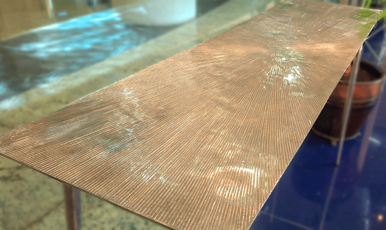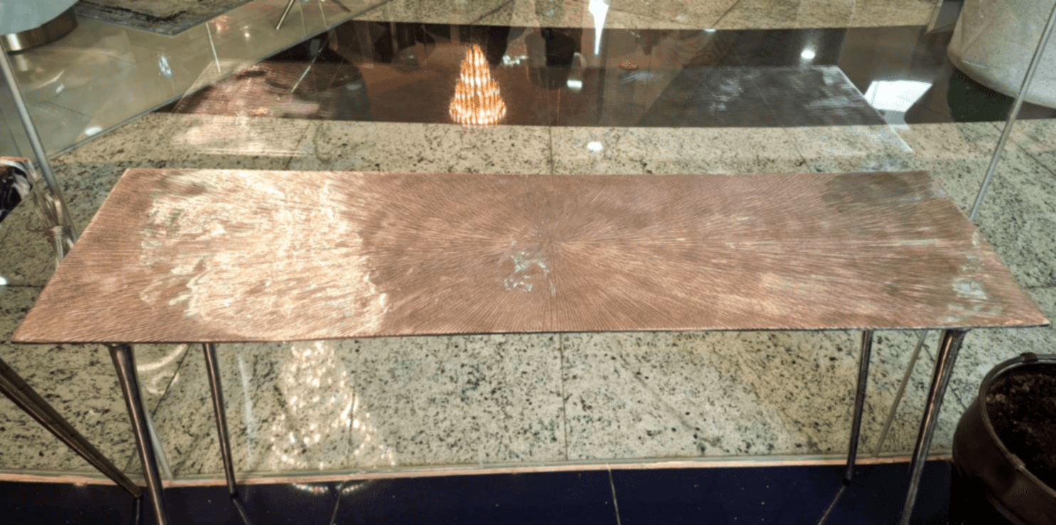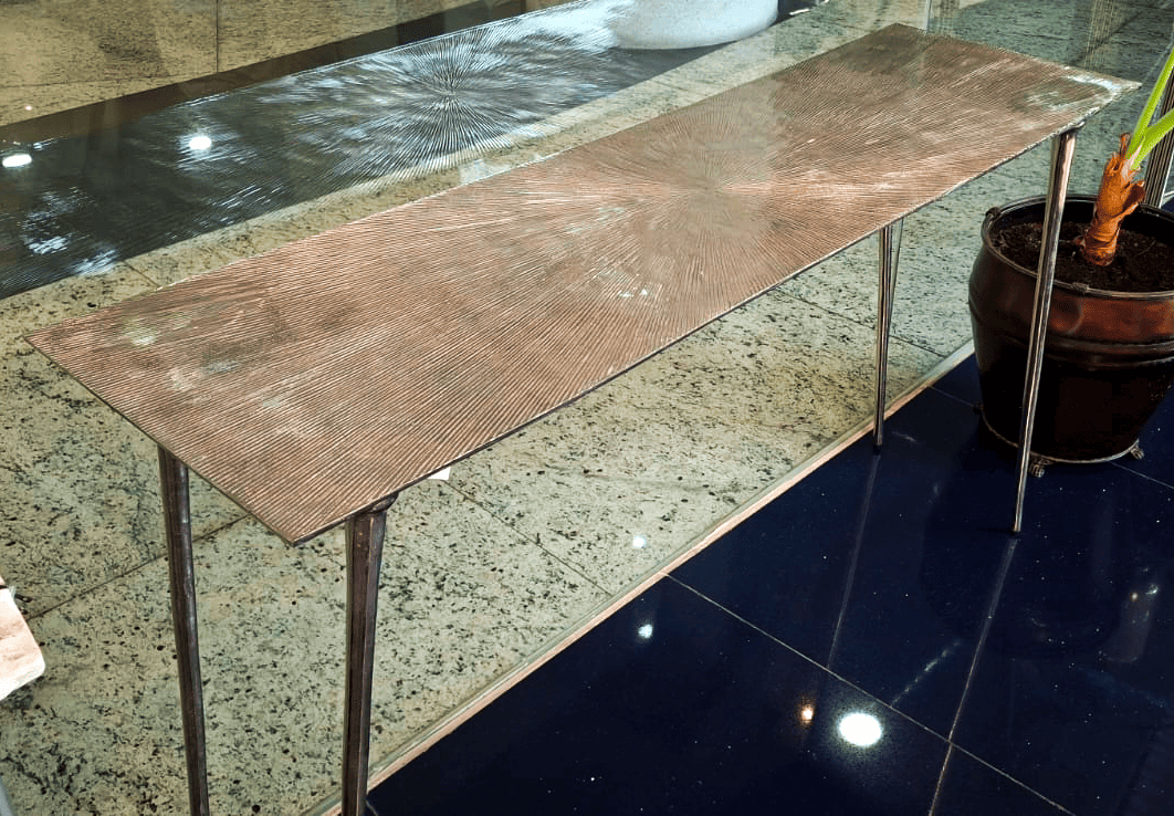 La consola de metal mostrada en la imagen es una pieza elegante y contemporánea que destaca por su diseño estilizado y materiales de alta calidad. Su estructura se basa en una tapa rectangular alargada con un acabado metálico que refleja la luz de manera sofisticada, generando un patrón radial que parece irradiar desde el centro hacia los bordes. Este efecto visual otorga dinamismo a la superficie, dándole un aspecto casi escultórico que la hace destacar como pieza decorativa además de funcional.