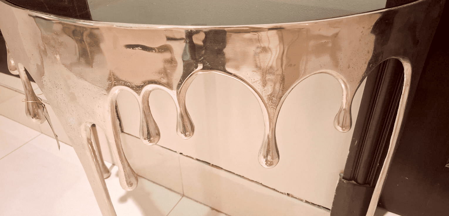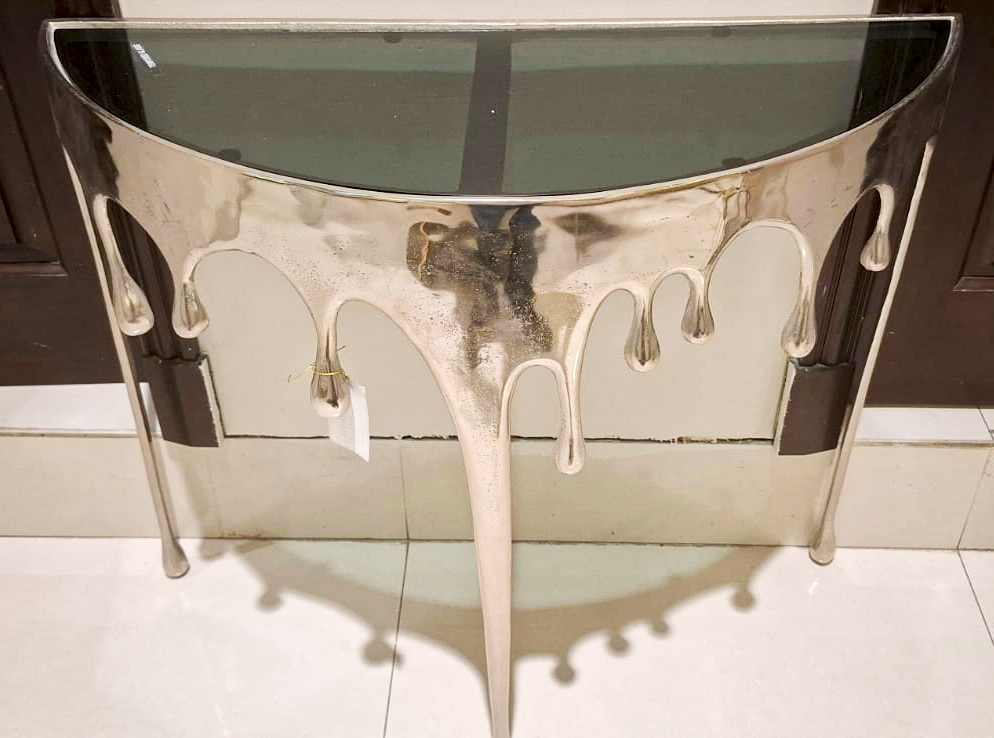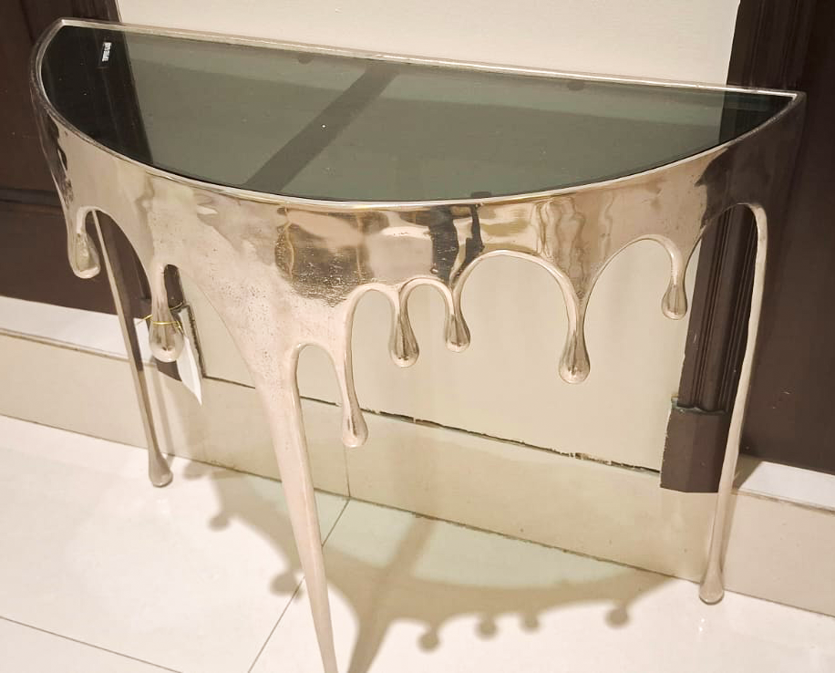 La consola plateada que se muestra en la imagen es una pieza de diseño artístico y vanguardista que inmediatamente capta la atención por su estilo único. Su forma semicircular clásica en la parte superior contrasta dramáticamente con el diseño de su estructura inferior, que simula una superficie metálica derritiéndose o goteando. Este efecto visual de “metal fundido” le da un carácter escultórico y dinámico, como si estuviera en constante movimiento, rompiendo con la rigidez habitual del mobiliario convencional.