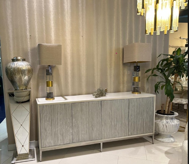 Hermosa credenza de madera con 4 puertas en colores blanco con plata acabados brillantes que haràn lucir su espacio elegante y lleno de glamour.