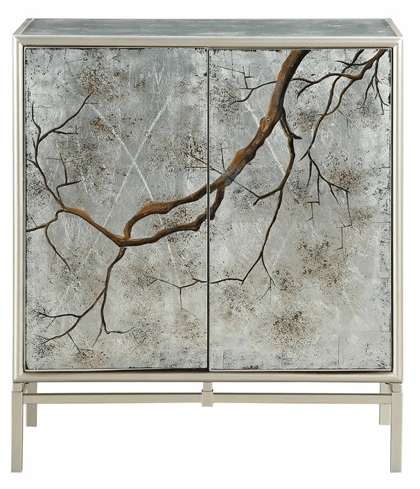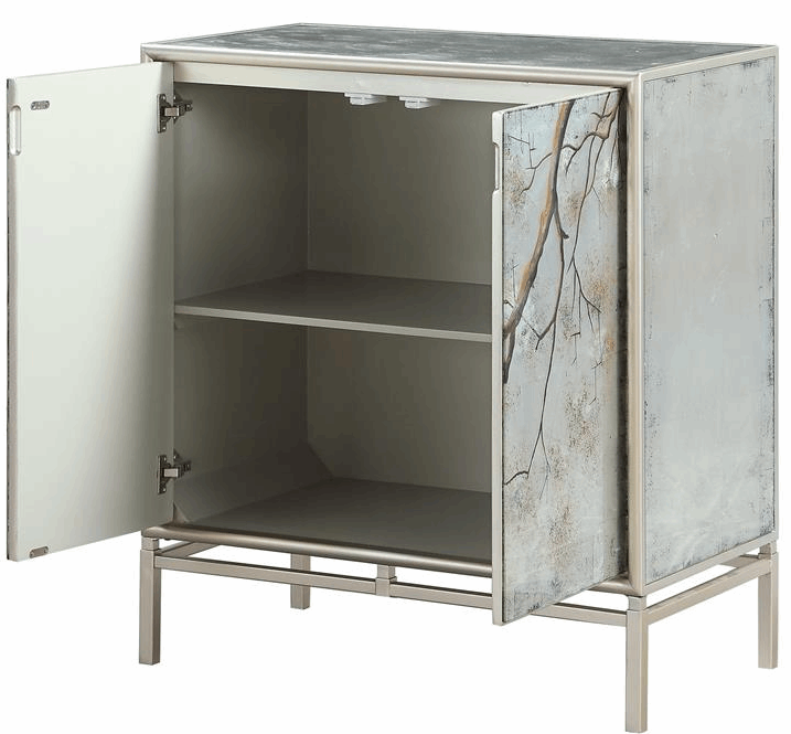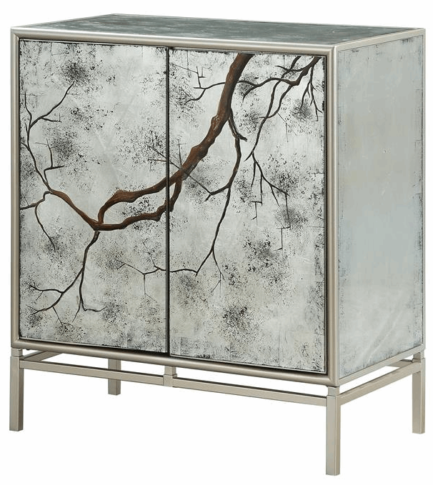 Las ramas pintadas a mano se capturan hermosamente contra un fondo helado en los frentes de las dos puertas de este cautivador gabinete. Este mueble lucirá espléndido en su hogar con quizás un espejo plateado colgando arriba y algunas fotografías enmarcadas en la parte superior.
