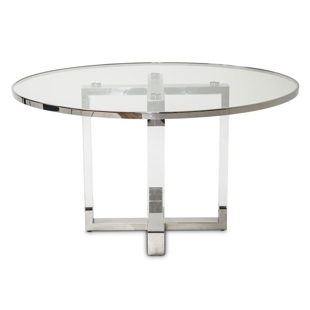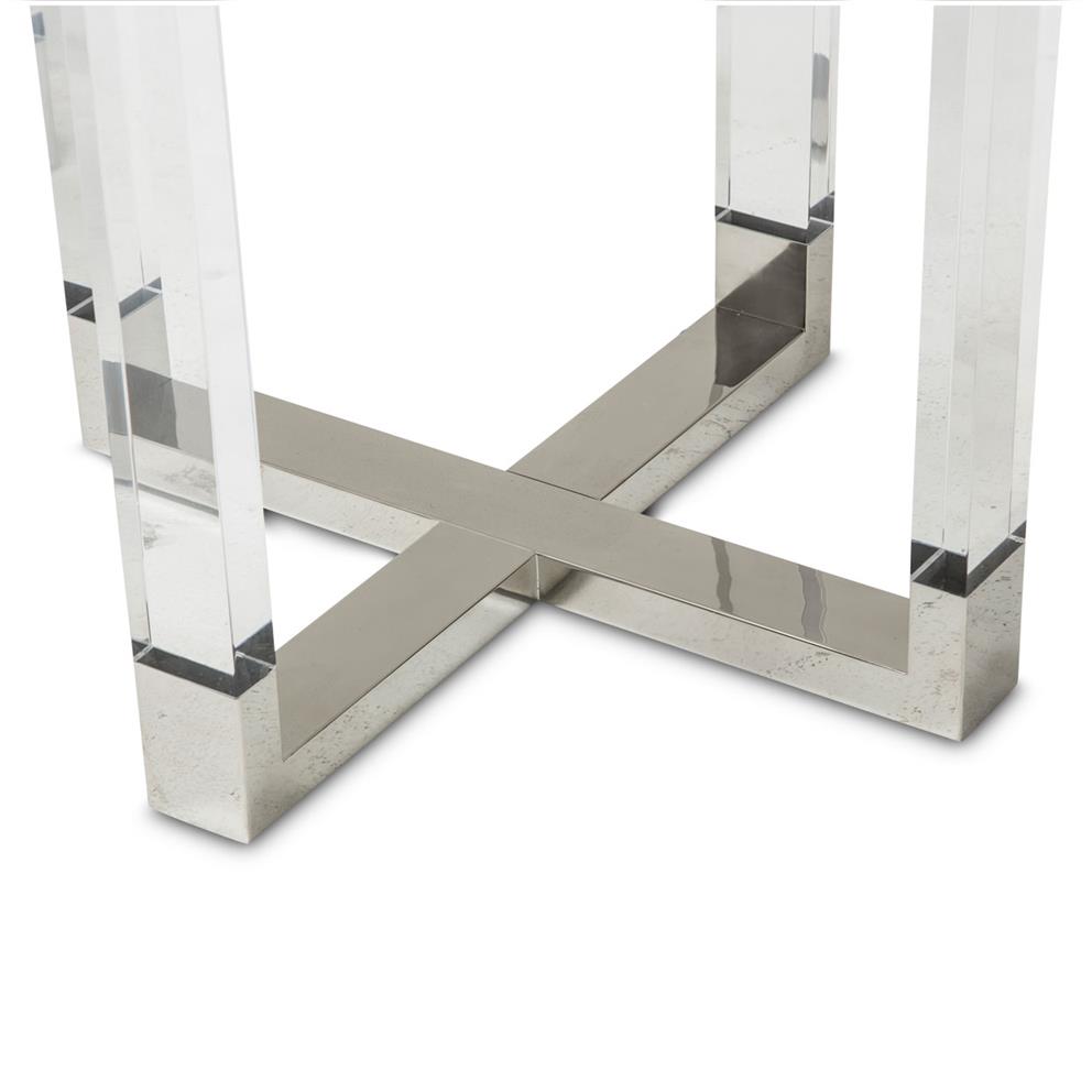DETALLES DEL PRODUCTO Y MÁSLa cubierta de la mesa es de cristal transparente, y está adornado con acero inoxidableLas patas están hechas con acrílico y metalLa base en cruz es de acero inoxidable