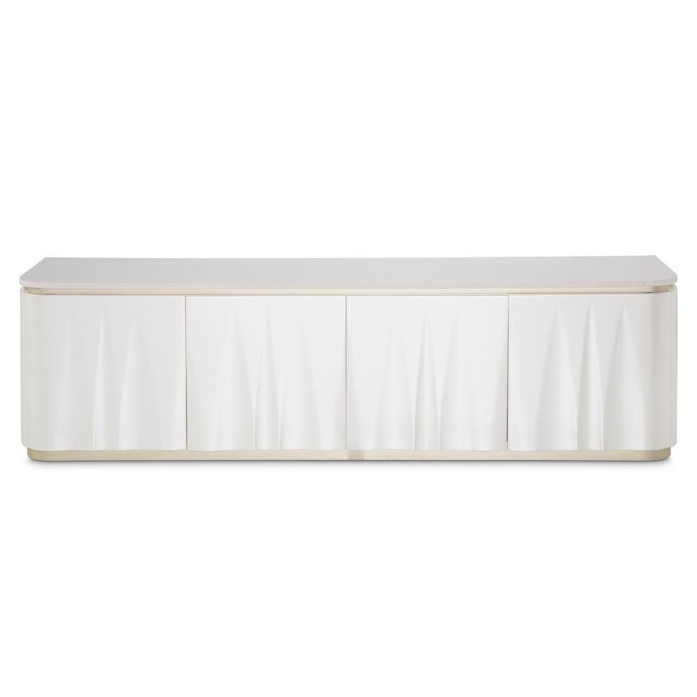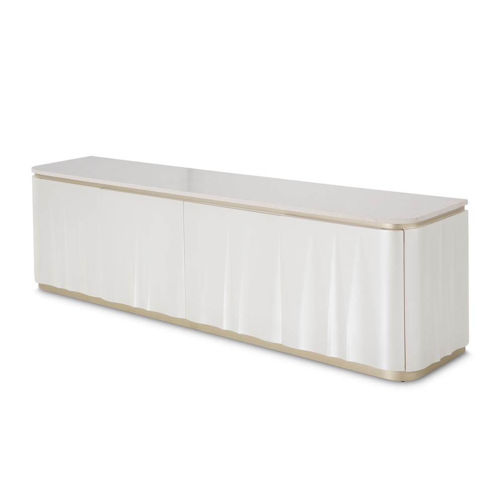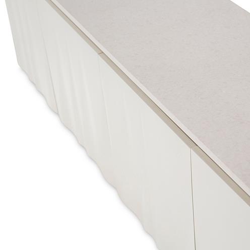 Con un acabado en blanco perla de alto brillo y detalles en tono champagne dorado en las molduras, el London Place combina funcionalidad con un estilo glamuroso. Sus líneas curvas en los extremos suavizan la forma rectangular del mueble, aportando un toque de fluidez y elegancia. La pieza descansa sobre una base sólida, también en acabado metálico suave, que le brinda estabilidad y un aire flotante sin perder presencia.